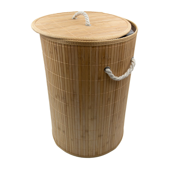Cesta para ropa elaborada en bambú natural, con diseño resistente y ligero. Ideal para organizar y almacenar prendas, aportando un toque cálido y elegante a la decoración del hogar.