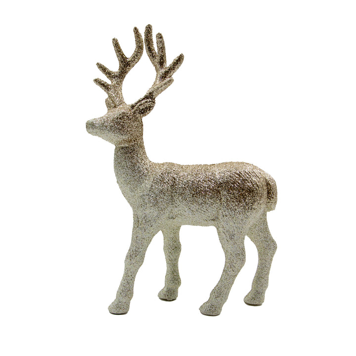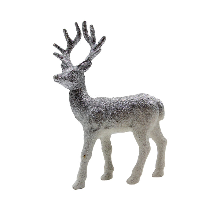 Reno decorativo de plástico con toques brillantes, ideal para añadir un detalle festivo y luminoso a tu decoración navideña.